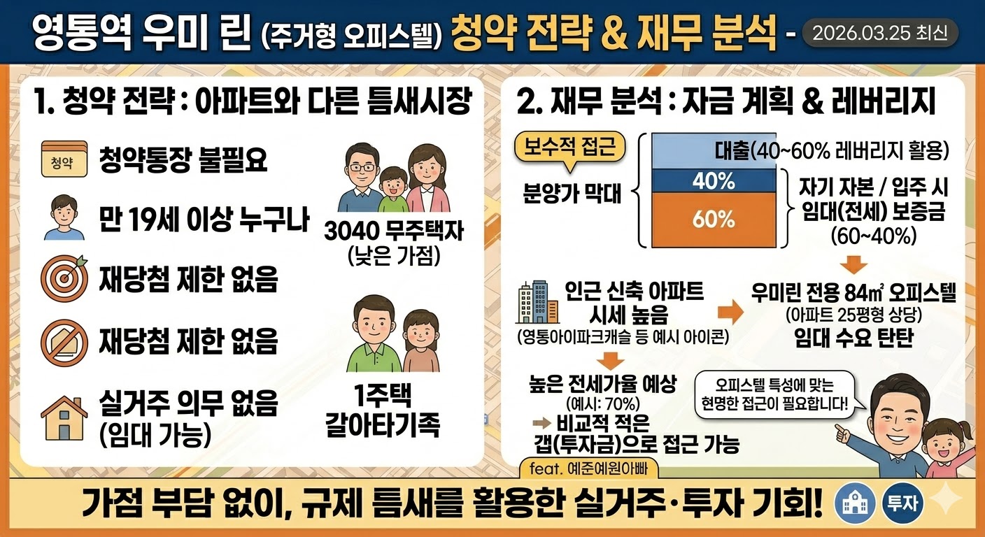 영통역 우미린은 오피스텔이기 때문에 가점제가 적용되는 아파트 청약과는 완전히 다른 전략으로 접근해야 합니다.