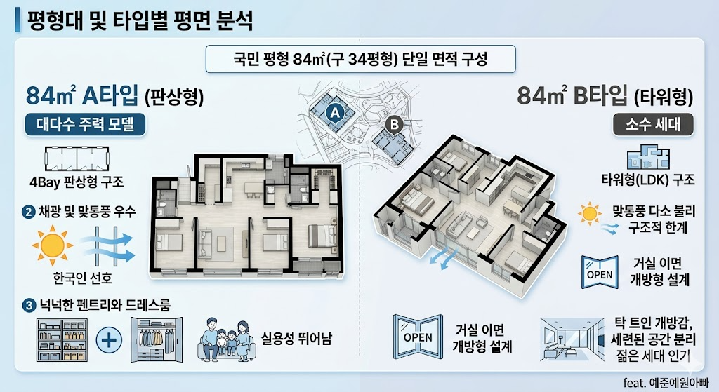 - 84㎡ B타입 (타워형): 소수 세대로 구성된 타워형(LDK) 구조입니다. 맞통풍은 다소 불리하지만, 거실 이면 개방형으로 설계되어 탁 트인 개방감과 세련된 공간 분리를 선호하는 젊은 세대에게 인기가 있습니다.