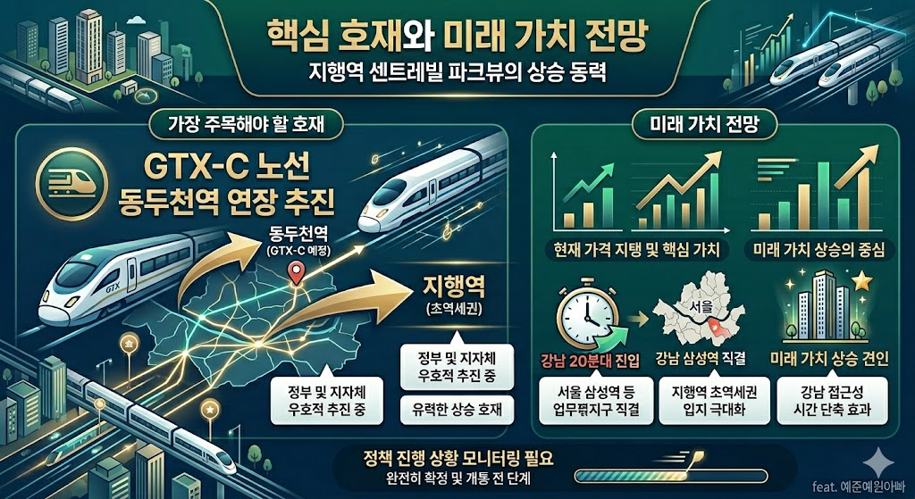 가장 주목해야 할 것은 GTX-C 노선의 동두천역 연장 추진입니다. 현재 정부와 지자체의 정책 방향성이 우호적으로 협상 및 추진되고 있는 유력한 호재입니다. 지행역의 바로 다음 역인 동두천역에 GTX-C가 들어서게 되면, 서울 삼성역 등 강남권 업무지구로의 접근성이 획기적으로 개선됩니다. 완전히 착공 및 개통이 확정된 단계는 아니므로 정책 진행 상황을 꾸준히 모니터링해야 하지만, 실현될 경우 지행역 초역세권인 이 단지는 가장 강력한 수혜를 입게 됩니다.