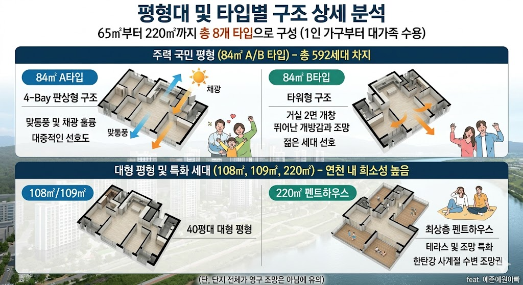 - 대형 평형 및 특화 세대 (108㎡, 109㎡, 220㎡): 연천 내 희소성이 매우 높은 40평대 이상의 대형 평형입니다. 특히 최상층에 위치한 220㎡ 펜트하우스를 비롯해 강 방향으로 배치된 일부 세대의 경우, 한탄강의 사계절을 집 안에서 감상할 수 있는 희소성 높은 수변 조망권을 확보하고 있습니다. (단, 단지 전체가 영구 조망을 갖는 것은 아님에 유의해야 합니다.)