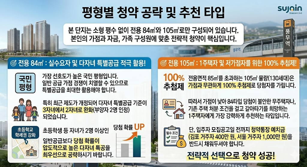 본 단지는 소형 평수 없이 전용 84㎡와 105㎡로만 구성되어 있습니다. 본인의 가점과 자금, 가족 구성원에 맞춘 전략적 청약이 핵심입니다.