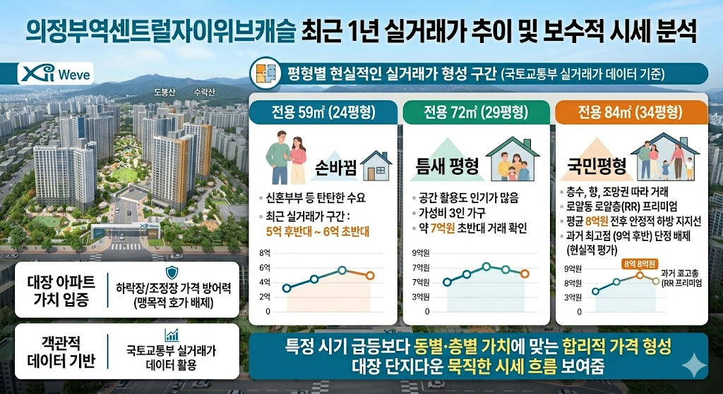 이처럼 의정부역센트럴자이위브캐슬은 특정 시기의 일시적인 급등보다는, 동별·층별 가치에 맞게 합리적인 가격대를 형성하며 대장 단지다운 묵직한 시세 흐름을 보여주고 있습니다.