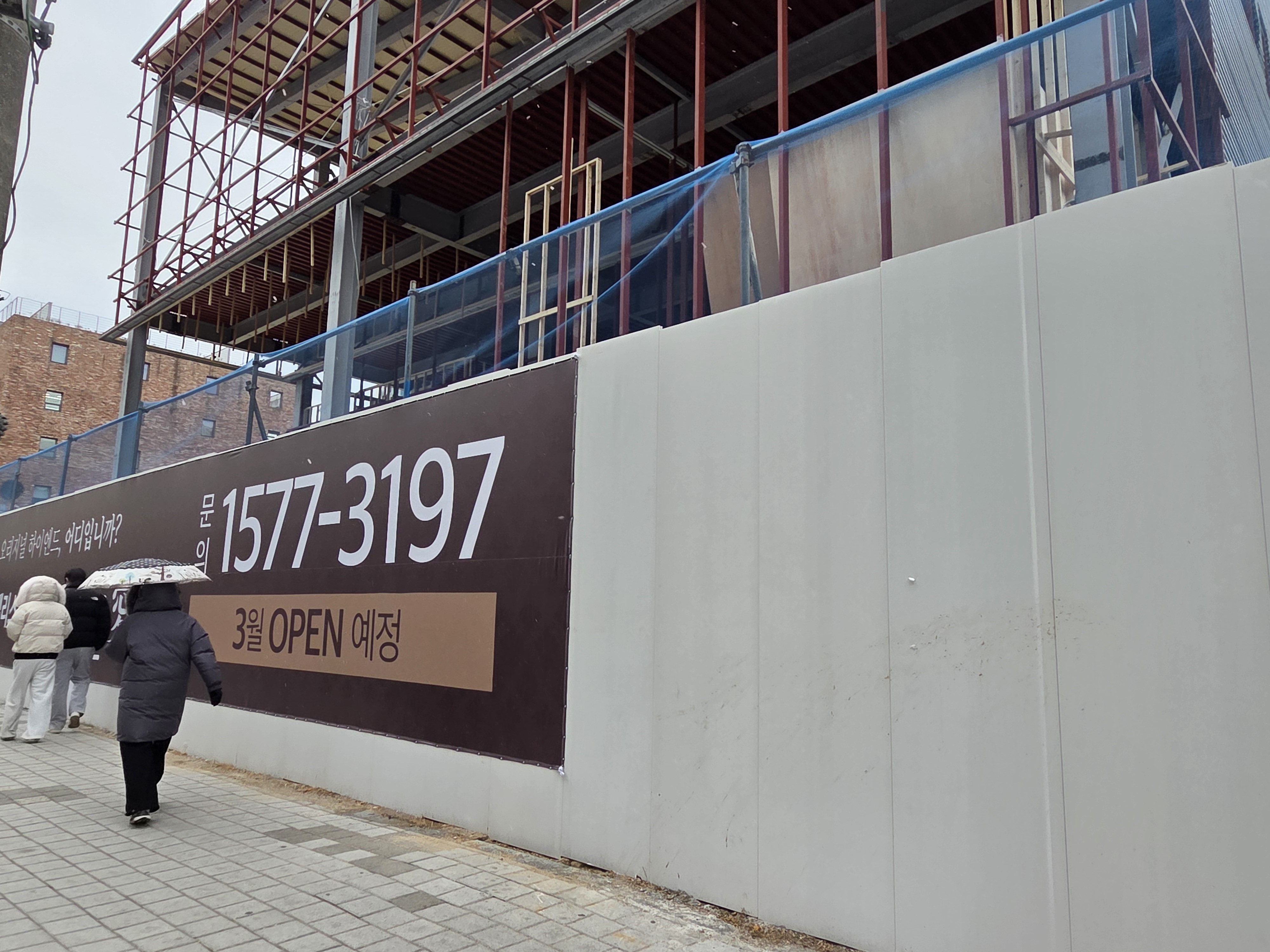 현수막에 "3월 OPEN 예정"이라는 문구가 선명합니다. 단순한 계획이 아니라, 실제로 3월 오픈을 위해 건설사가 밤낮없이 움직이고 있다는 증거입니다.