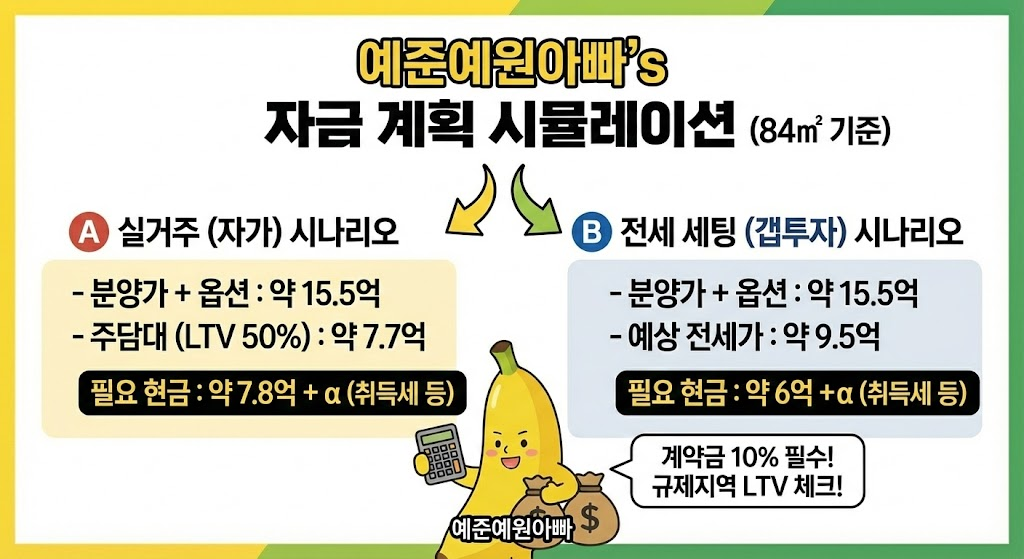 - 규제지역 LTV 제한으로 중도금 대출이 50%까지만 나올 수 있으므로, 10% (약 1.5억) 자납 가능성을 대비해야 합니다.