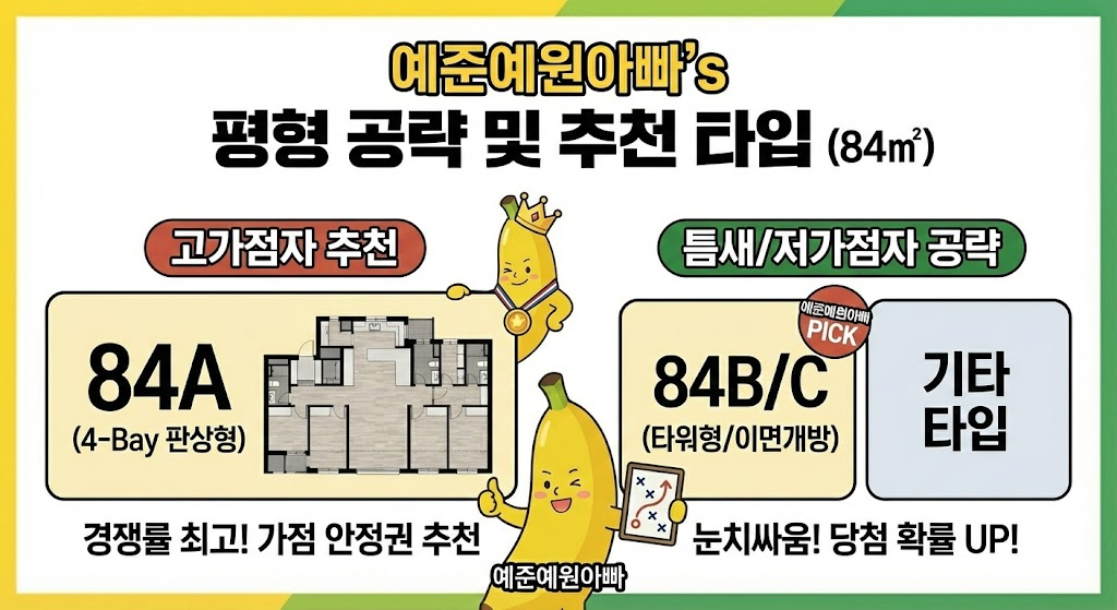 - 84C/D: 구조가 조금 독특하거나 향이 남서/남동일 경우 상대적으로 경쟁률이 낮습니다. "무조건 서울 당첨"이 목표라면 비선호 타입을 과감하게 선택하세요.