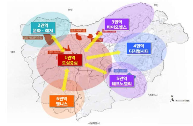 - 1도심 (의정부·가능): 행정, 업무, 상업의 중심지입니다. GTX-C 의정부역을 필두로 고밀도 개발이 진행되며 명실상부한
