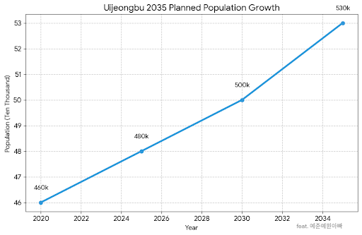 2035년 계획 인구는 약 53만 명(상주인구+주간활동인구)으로 설정되었습니다. 인구가 줄어드는 지방 소도시와 달리, 의정부는 각종 개발 사업과 교통 호재를 바탕으로 꾸준한 인구 유입을 목표로 하고 있습니다. 인구의 증가는 곧 수요의 증가를 의미하며, 이는 부동산 가격의 가장 강력한 하방 경지선이 됩니다.
