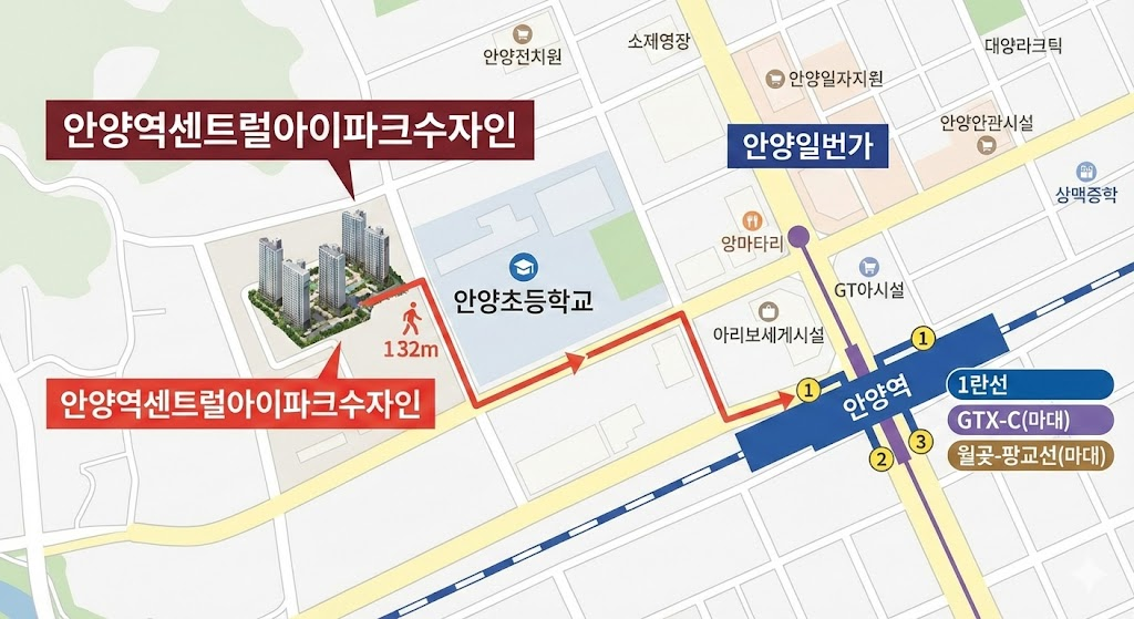 안양역은 단순한 1호선 역에서 수도권 남부의 핵심 환승 거점으로 변모하고 있으며, 그 수혜의 정점에 안양역센트럴아이파크수자인이 있습니다.