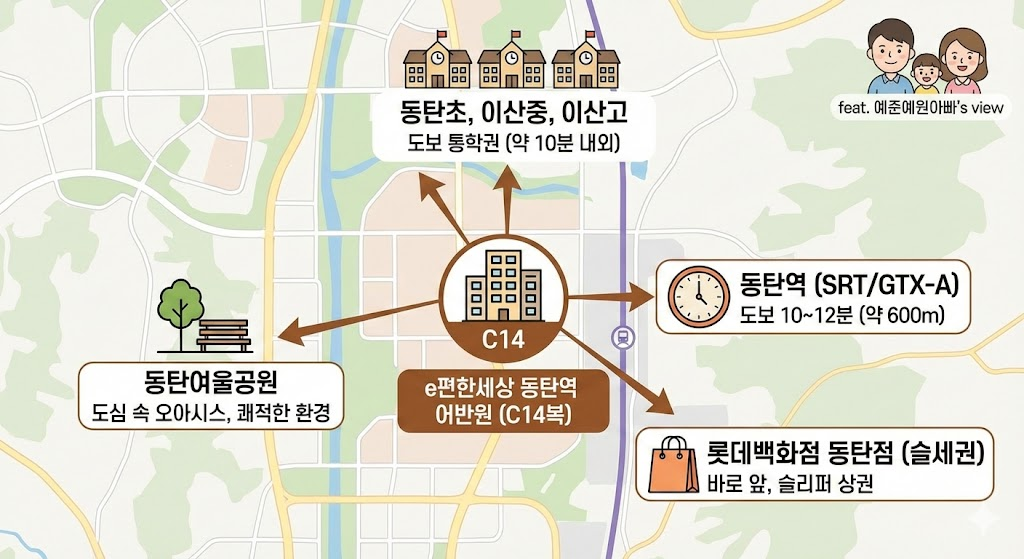 - 미래 가치: 2028년 C14 입주 시점에는 GTX-A 삼성역 구간 개통이 가시화되고, 트램 등 교통 호재가 완성되는 시기입니다. 동탄역의 가치는 지금보다 우상향할 가능성이 매우 높습니다.