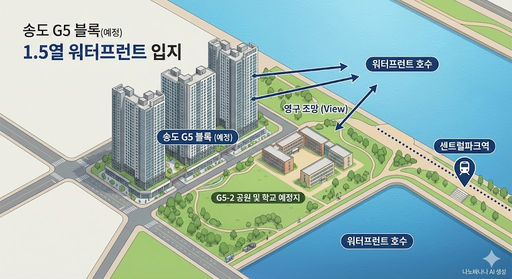 - G5 블록: 워터프런트 호수 라인 안쪽에 위치.