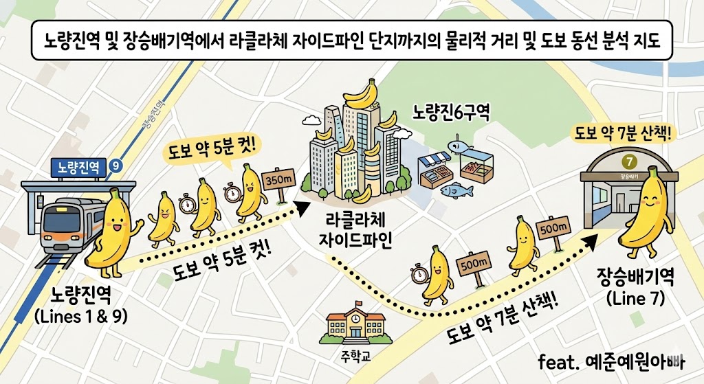 [노량진역 및 장승배기역에서 라클라체 자이드파인 단지까지의 물리적 거리 및 도보 동선 분석 지도 feat. 예준예원아빠]