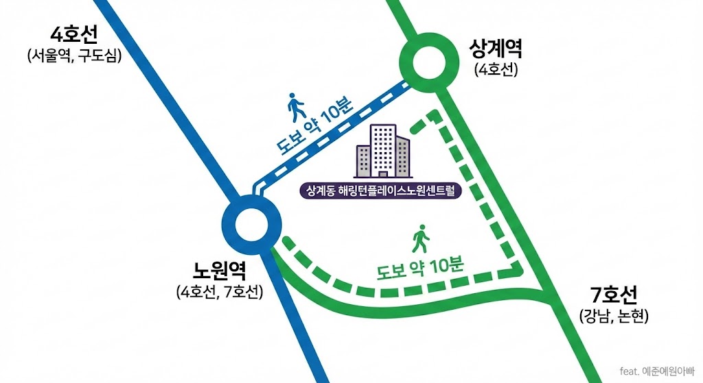 지하철 4호선과 7호선 환승역인 노원역, 그리고 4호선 상계역을 도보 8~10분 내외로 이용할 수 있는 완벽한 더블 역세권입니다. 7호선을 탑승하면 강남구청, 논현 등 강남 핵심 업무지구로 환승 없이 직결되며, 4호선을 통해 사당 및 서울역 등 구도심 접근성도 매우 훌륭합니다.