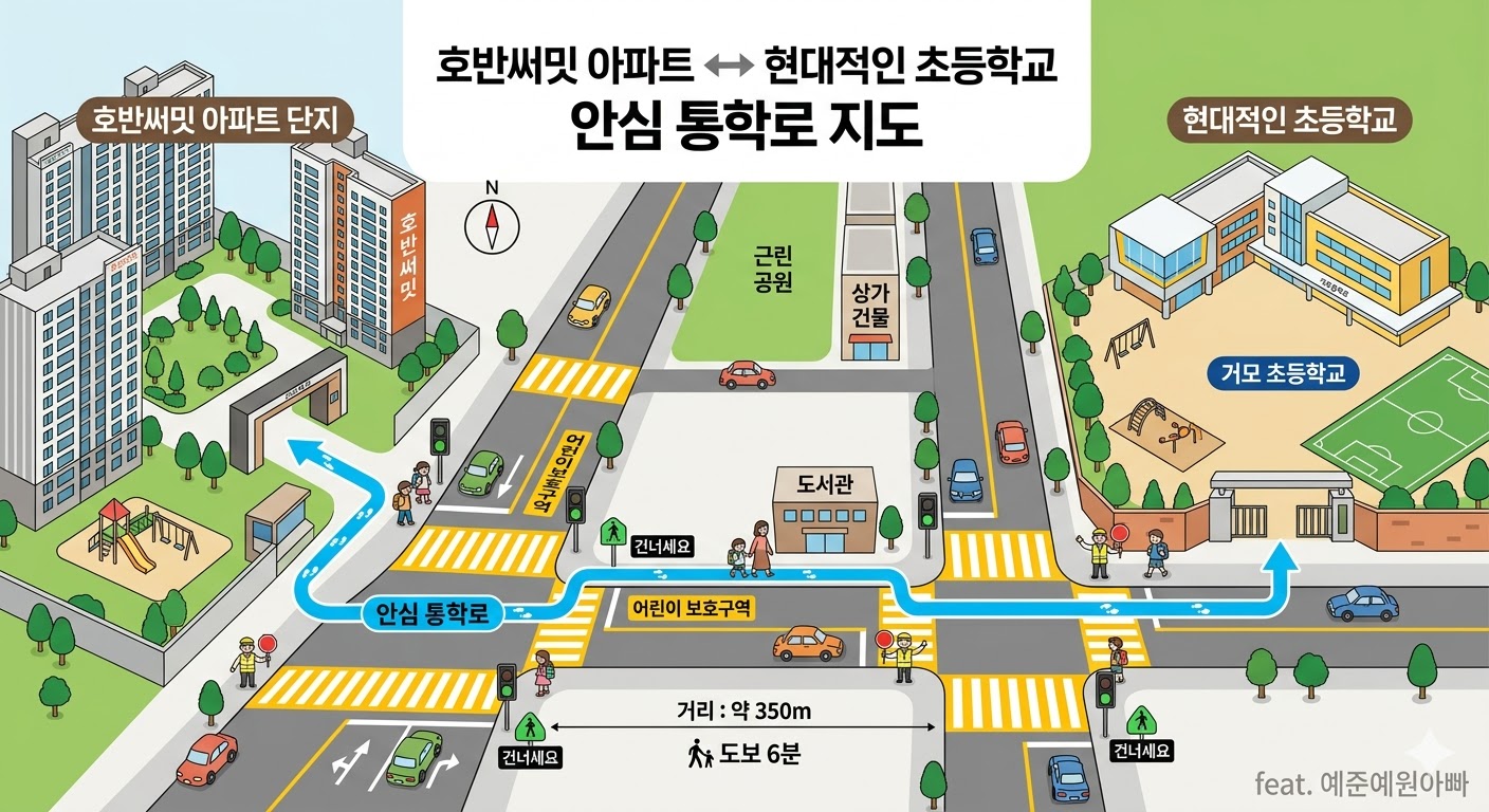 아파트 단지(호반써밋)에서 안전한 횡단보도를 건너 현대적인 초등학교로 이어지는 통학로를 보여주는 일러스트 지도. 거리와 동선이 직관적으로 보이는 깔끔한 인포그래픽 스타일.
